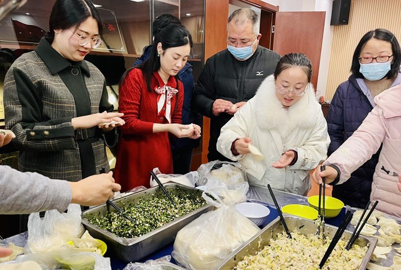 学院党政领导带头参与,教职工积极响应,争先动手包饺子,并开心品尝饺子,活动场面气氛热烈,欢声笑语不绝于耳,教职工平日的工作压力在活动中得到释放。期间,教工党支部为部分教工党员过政治生日,还进行了教职工中华传统文化知识竞赛答题活动。