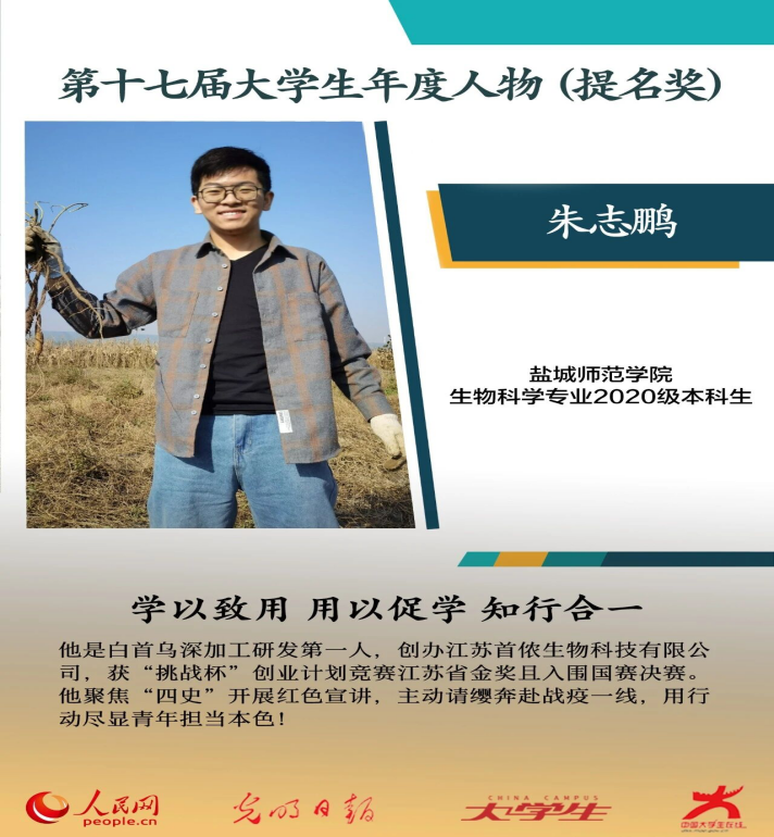 朱志鹏是我院生物科学(师范)专业2020级本科生,现为校学生会执行主席。他学习刻苦踏实,成绩名列前茅,具有较强的专业理论素养和实践创新能力,曾获国家奖学金,连续4次获得一等奖学金,带领团队发表高水平学术论文7篇,获批国家发明专利6项,创办江苏首侬生物科技有限公司,获“挑战杯”创业计划竞赛江苏省金奖且入围国赛决赛。