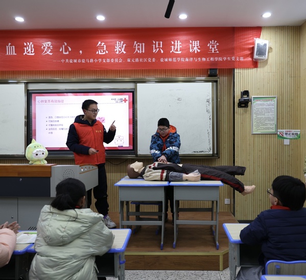 此前,海生院学生党支部学生党员前往盐城市红十字会应急救护培训基地,参加了关爱生命救在身边科普宣教活动,学习了心肺复苏、气道异物梗阻、AED使用等理论知识,跟随培训师掌握了海姆立克法的操作技能,并取得了心肺复苏培训证书,为本次爱心课堂活动做了充分的准备。