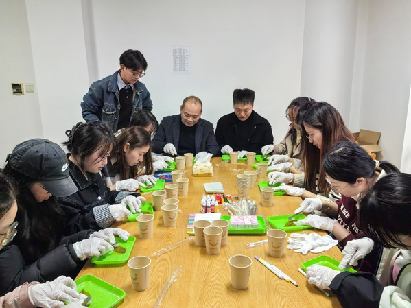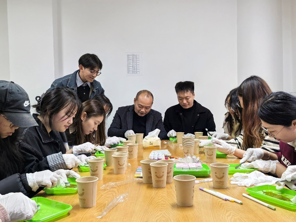 针对叶脉染色晕染不均、装饰绳打结松散等问题,陈晨老师指出浅色系染色需遵循“少量多次”原则,同时,孙雨老师现场示范绳结固定技巧。师生们专注投入创作,融入干花、简约纹路等创意元素。一枚枚兼具自然肌理与个性设计的叶脉书签陆续成型,师生们相互展示点评,现场氛围和谐有序。